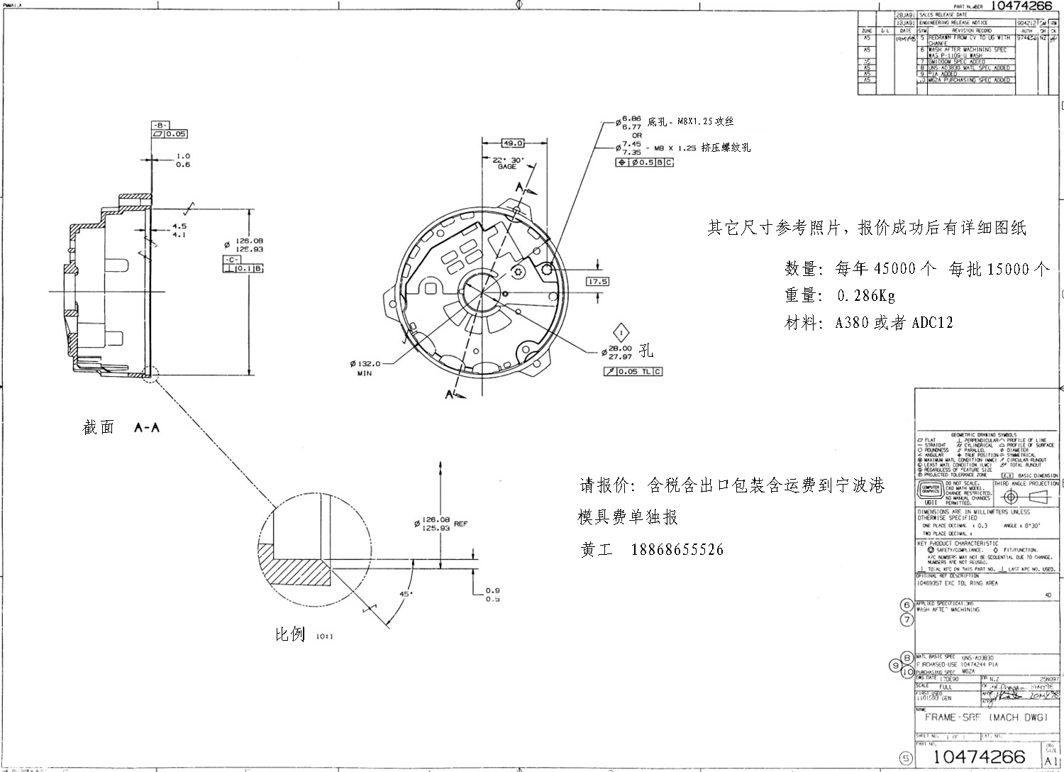 或者A380,單件重量,0.286Kg。壓鑄,清理,機加工(車,鉆孔,攻絲),去毛刺,檢驗