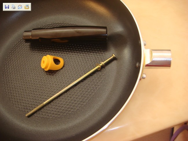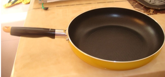 直徑26cmX 4.5cmH.厚度2MM 。凈重:0.6KG。內噴不粘,外噴黃色高溫漆。手柄:電木手柄