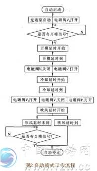 筆者設計的壓鑄模型芯針冷卻控制裝置包括電氣控制系統、制冷控制系統、循環水冷卻系統和吹氣冷卻系統。 工作方式設有手動和自動模式。 圖2 為自動模式的順序流程圖。
