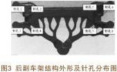 后副車架細小針孔分布見圖3,定模上型芯針的分布見圖4。 型芯針內部冷卻通道直徑1.8mm。