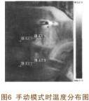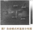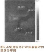 實驗中,設置了三組試驗:第一組為不使用型芯針冷卻控制裝置;第二組為設置型芯針冷卻控制裝置處于手動狀態;第三組為設置型芯針冷卻控制裝置處于自動狀態。 在這三組實驗中,使用熱成像儀捕捉開模后后副車架定模上芯針溫度分布情況,通過三組試驗的數據對比,來評價型芯針冷卻控制裝置的冷卻效果。圖5 為不使用型芯針冷卻裝置時定模型針的溫度分布圖。圖6為使用手動模式時的溫度分布圖。圖7為使用自動模式時的溫度分布圖。