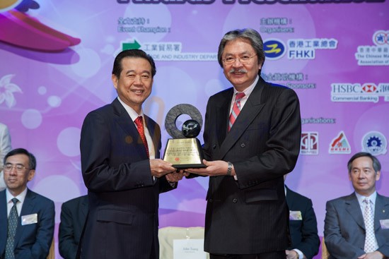 香港財政司司長曾俊華先生(右)為力勁集團(tuán)創(chuàng)始人劉相尚先生頒發(fā)"機(jī)器及機(jī)械工具設(shè)計大獎”