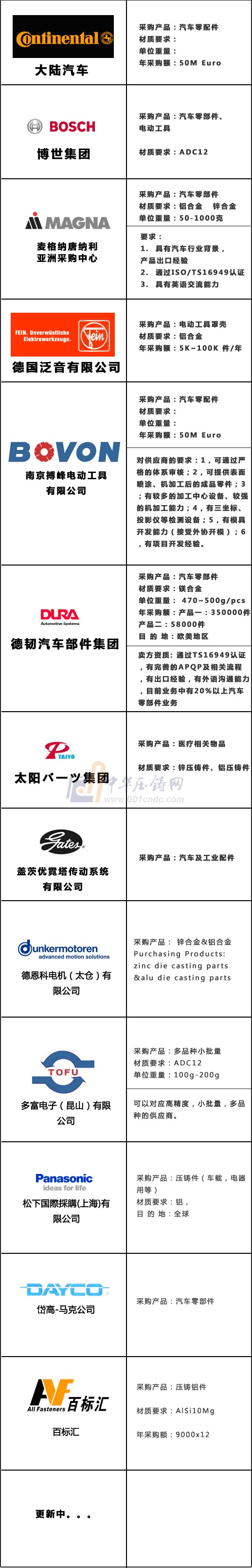 現(xiàn)已積聚近20家優(yōu)質(zhì)采購(gòu)商參與,采購(gòu)項(xiàng)目包括汽車零部件、電動(dòng)工具、醫(yī)療相關(guān)產(chǎn)品、3C電子等多個(gè)行業(yè),主要為鋁、鎂、鋅壓鑄件。更多采購(gòu)項(xiàng)目請(qǐng)關(guān)注中華壓鑄網(wǎng)最新資訊。