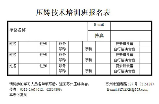 為提高壓鑄企業技術管理人員的壓鑄技術水準,確實幫助他們學得一些實用壓鑄技術,用以增強他們的技術業務能力,為企業的發展多作貢獻。我會定于2012年11月19~25日舉辦“第十一期壓鑄技術培訓班”。現將有關事項通知如下: