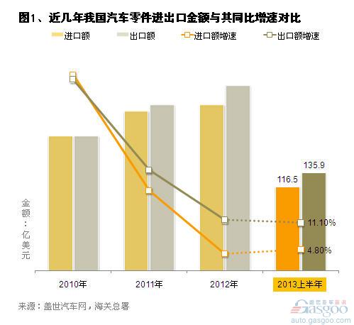 2010年,我國(guó)汽車(chē)零件順差僅有0.1億美元,而至2012年已擴(kuò)大到27億美元,今年僅上半年順差已達(dá)19.4億美元,相信今年整年我國(guó)汽車(chē)零件的貿(mào)易順差將比去年進(jìn)一步擴(kuò)大。