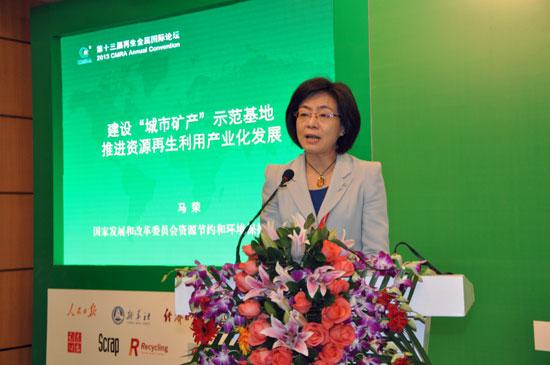 國(guó)家發(fā)改委資源與環(huán)境司副司長(zhǎng)馬榮做了《建設(shè)“城市礦產(chǎn)”示范基地 推進(jìn)資源再生利用產(chǎn)業(yè)化發(fā)展》的專題演講。