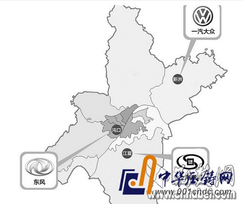 三大汽車集團將在武漢聚首。2006年東風汽車公司將總部從十堰遷至武漢,揭開了武漢打造“中國車都”的雛形。2012年10月,上海通用的新基地選址江夏,與東風集團僅一江之隔。加上將在新洲建廠的一汽大眾,武漢成為中國首個坐擁三大汽車集團的城市。