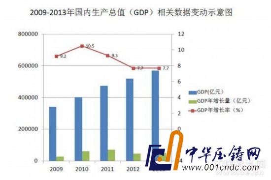 那么事實如何呢?中國經濟持續三十多年的超高速增長世界罕有。然而,任何國家也不可能一直行駛在“快車道”上,這也不符合經濟發展的客觀規律。隨著時間的推移,中國的經濟總量越來越大,如今每增長一個百分點,其GDP絕對數與往昔不可同日而語。比如2013年GDP增長7.7%,看似明顯低于2009年9.2%的增速,但實際上,2013年GDP增長的絕對數約5萬億,而2009年增長的絕對數只有約2.7萬億,就經濟增長量而言,2013年要大大超過2009年。