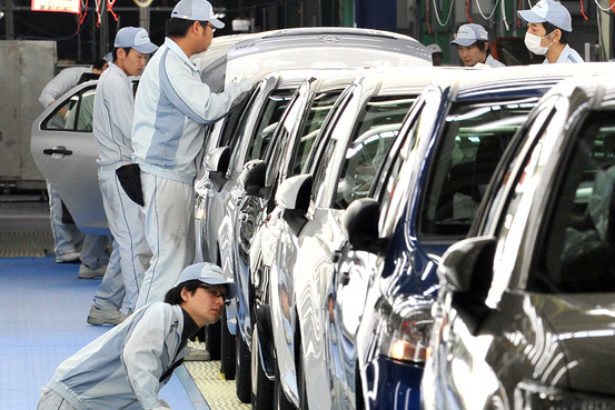 2012年5月11日,日本宮城縣,豐田汽車公司的工人在檢查科羅拉汽車的噴漆和車身。