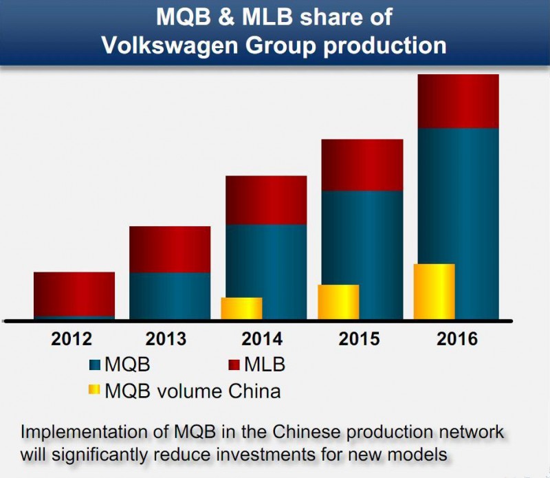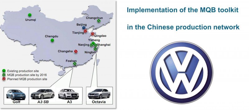大眾汽車中國(guó)本月向投資者提供的資料顯示,在中國(guó)的產(chǎn)能網(wǎng)絡(luò)中,將有8座工廠投產(chǎn)MQB(Modular Querbaukasten)模塊化發(fā)動(dòng)機(jī)橫置平臺(tái)衍生的車型。作為對(duì)比,2013年5月大眾在華簽約上海大眾長(zhǎng)沙工廠時(shí),資料中給出的MQB工廠數(shù)量為3座。