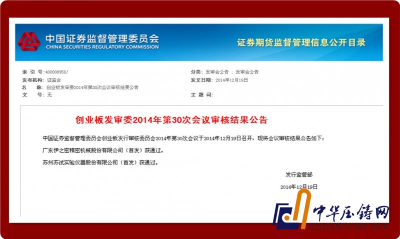 12月19日,籌備多年的伊之密首次公開發行股票并在創業板上市申請通過了中國證監會創業板發行審核委員會審核,伊之密有望成為國內模壓成型裝備行業在深交所創業板上市第一股。