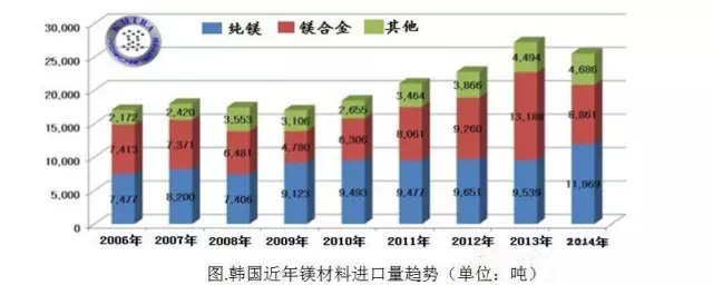 從近期的鎂材料進口量來看,隨著智能手機市場的發展,對于鎂材的需求量出現了激增,2013年為27221噸,達到了最高值,但去年為25516噸,表明鎂材需求已經出現了衰退跡象。