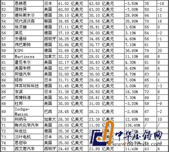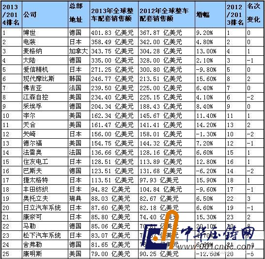 下表為2014年全球汽車零部件配套供應商百強名單: