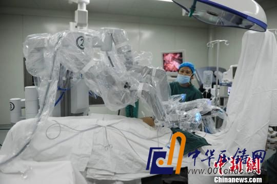 患者躺在手術(shù)臺(tái)上,肚子上被“打”了幾個(gè)黃豆大小的創(chuàng)口,機(jī)器人把機(jī)械手臂放進(jìn)了體內(nèi)進(jìn)行手術(shù)。