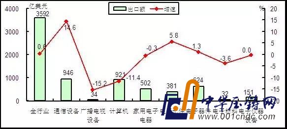 進口方面,電子器件(1372億美元,1.9%)、計算機(259億美元,-8.8%)、電子元件(225億美元,-5.3%)、電子儀器設備(220億美元,-7.9%)、通信設備(227億美元,6.1%)、家用電子電器(91億美元,-4.1%)、電子材料(36億美元,-8.0%)、廣播電視設備(18億美元,-16.8%)。主要產品進口額排前五位的分別是:集成電路(1032億美元,4.0%)、液晶顯示板(196億美元,-6.6%)、手持式無線電話用零件(144億美元,2.5%)、硬盤驅動器(74億美元,0.6%)和印刷電路(57億美元,-3.6%)。