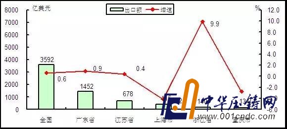 六、主要省市進出口差異明顯出口方面,排名前五位的省市分別是:廣東省(1452億美元、0.9%)、江蘇省(678億美元、0.4%)、上海市(415億美元、-4.2%)、浙江省(140億美元、9.9%)和重慶市(134億美元、-2.8%)。貴州、山西等省份出口增長較快增速,均超過100%。
