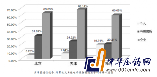 從專利申請人類型看,京津冀三地通信設備、計算機及其他電子設備制造領域的研發主體均為企業,其有效專利占當地有效專利總量的比重分別為63.03%、68.14%和60.05%。其中,依托北京豐富的科技教育資源,大專院校和科研院所也成為北京專利產出和儲備的重要主體,其擁有的有效專利量占當地專利資源量的比重高達31.69%;而天津、河北高校及科研院所擁有的專利資源量則少得多。特別值得注意的是,河北的個人專利占比高達19.74%,意味著其技術創新水平整體較低。