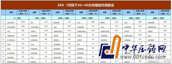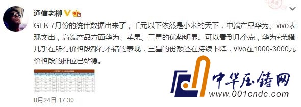 @通信老柳 表示:GFK 7月份的統(tǒng)計數(shù)據(jù)出來了,千元以下依然是小米的天下,中端產(chǎn)品華為、vivo表現(xiàn)突出,高端產(chǎn)品方面華為、蘋果、三星的優(yōu)勢明顯。可以看到幾個點,華為+榮耀幾乎在所有價格段都有不錯的表現(xiàn),三星的份額還在持續(xù)下降,vivo在1000-3000元價格段的排位已站穩(wěn)。