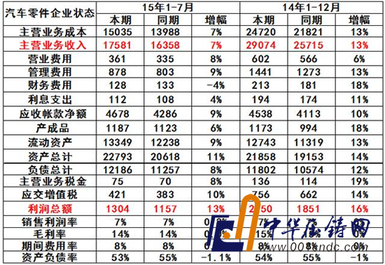 2014年的汽車零部件行業(yè)的銷售收入達到2.9萬億元,同比增長13%。而2014年的汽車零件企業(yè)利潤表現(xiàn)也明顯改善,利潤2,150億元,較2013年增幅16%。2015年1~7月汽車零部件企業(yè)的收入和成本均保持增長較好,利潤同比增13%。其中的增值稅和主營稅金均增長較好。