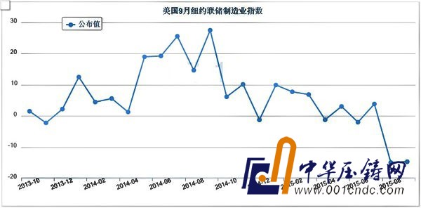數據顯示,美國紐約聯儲9月紐約州制造業指數從為-14.7,與8月的-14.92變化不大,8月為自2009年4月以來最低。
