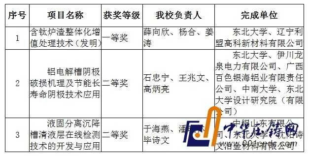 日前,2015年度中國有色金屬工業科學技術獎評選結果在《中國有色金屬報》、中國有色金屬工業協會網、中國有色金屬學會網和中國有色金屬科技信息網等全國有色行業主流媒體公布,東北大學共獲得一等獎1項、二等獎2項。其中,薛向欣、楊合、姜濤完成的“含鈦爐渣整體化增值處理技術(發明)”獲得一等獎,石忠寧、王兆文、高炳亮完成的“鋁電解槽陰極破損機理及節能長壽命陰極技術應用”和于海燕、潘曉林、畢詩文完成的“液固分離沉降槽清液層在線檢測技術的開發與應用”分別獲得二等獎。具體獲獎情況如下: