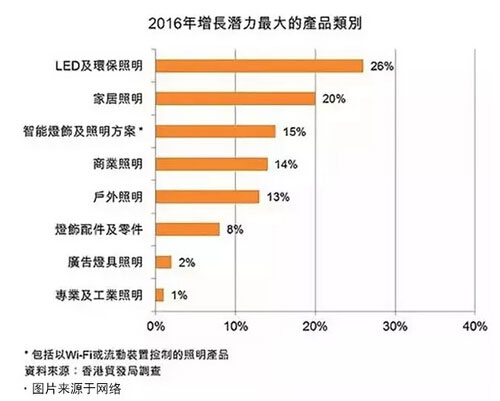 產品方面,LED及相關環保照明是2016年最具增長潛力的產品類別,其次是其他家居照明產品(占20%)。