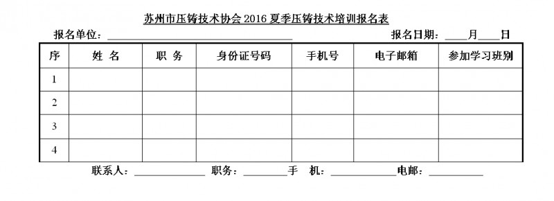 (一)登錄《中國壓鑄技術網》(www.diecasting-tech.com)下載“蘇州市壓鑄技術協會2016夏季壓鑄培訓報名表”,或關注微信訂閱號“蘇州壓鑄”獲取報名信息,將報名表通過電子郵件返回蘇州市壓鑄技術協會。