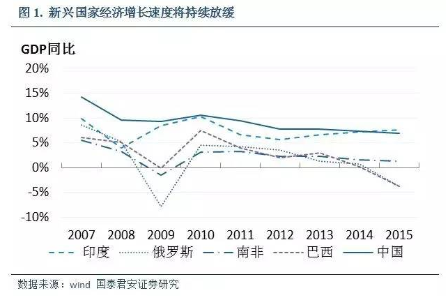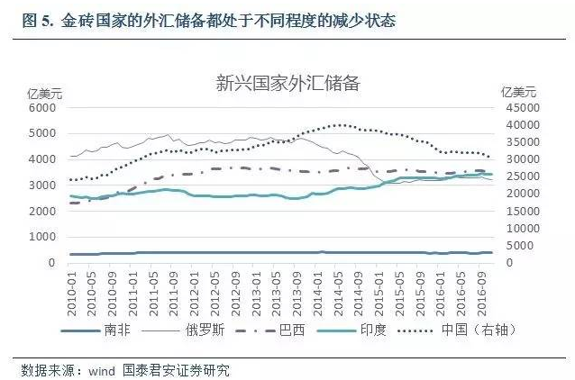從2010年以來,除了印度以外,中國、俄羅斯、巴西、南非等金磚國家的經濟增長速度基本都行于下降通道中。2017年,川普的貿易保護主義政策如果啟動,外貿市場嚴重依賴美國的印度經濟增長速度也會相應放緩。而川普的能源自給政策將導致美國進口能源占比下降,削弱全球能源市場的需求增長動力,對俄羅斯、巴西等資源國的影響無異于雪上加霜。