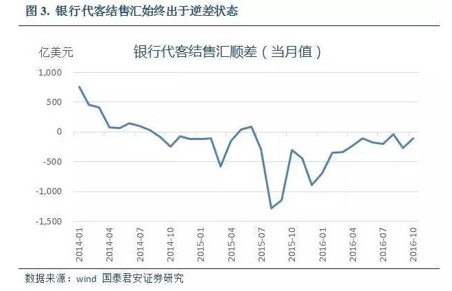 中國經濟增長速度的放緩和美元指數(shù)的持續(xù)上升導致部分資本尋求更加多元化的資產配置,企業(yè)和個人將部分人民幣資產置換成美元資產的動力增強。數(shù)據(jù)顯示,從2014年三季度開始,資產項下開始出現(xiàn)凈流出,銀行代客結售匯始終出于逆差狀態(tài)(如圖3),表明國內資金對外投資動力增強,資本外流壓力始終存在。