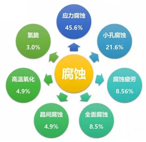 應(yīng)力腐蝕是危害最大的腐蝕,經(jīng)統(tǒng)計(jì),各種腐蝕所占的比例如下,可見應(yīng)力腐蝕的比例是非常大的