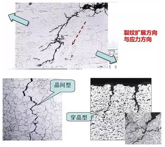 d. 裂紋的途徑一般有沿晶型、穿晶型和混合型(見下圖所示)