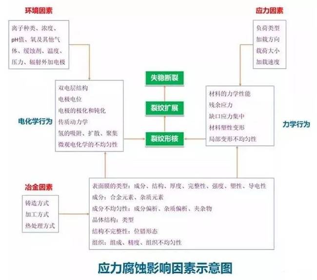 1. 綜合應(yīng)力及腐蝕的機(jī)理,產(chǎn)生應(yīng)力腐蝕主要有4個(gè)方面的因素:環(huán)境、電化學(xué)、力學(xué)、冶金,各因素影響的關(guān)系大致見下圖