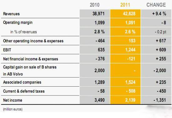 2011年全年,雷諾汽車營業收入為426.28億歐元,與2010年的389.71億歐元相比,增長了9.4%。其中第四季度營業利潤(Operating Margin)為10.91億歐元,較2010年的10.99億歐元略有下滑,降幅為0.7%。因而利潤率從2010年的2.8%下降到2.6%。