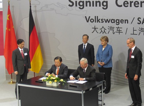 本網訊 德國當地時間4月23日,中國第一汽車股份有限公司與德國大眾汽車股份公司在沃爾夫斯堡簽署了一汽-大眾汽車有限公司(下面簡稱“一汽-大眾”)合資合同延長25年聯合聲明。正在德國大眾訪問的中國總理溫家寶與德國總理默克爾共同出席了簽字儀式。