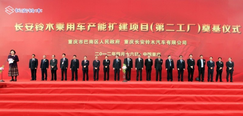 重慶市市長黃奇帆、副市長童小平,市人大常委會副主任余遠牧,市政協副主席彭永輝,日本國駐重慶總領事館首席領事鶴崗千晴,中國南方工業集團公司黨組副書記、副總經理,中國長安汽車集團董事長徐留平,長安汽車總裁張寶林、副總裁王重生,鈴木株式會社副社長鈴木俊宏,巴南區區委書記李建春、區長段成剛,長安鈴木總經理近藤唯志,長安鈴木常務副總經理陳華述等出席了奠基儀式。