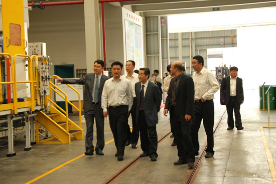 公司高層陪同路市長一行在超大壓鑄機裝配車間參觀,左一為集團CEO曹陽先生,左二為路軍市長,左三為集團創始人劉相尚先生,右一為華南市場部銷售總監鄧毅明先生。