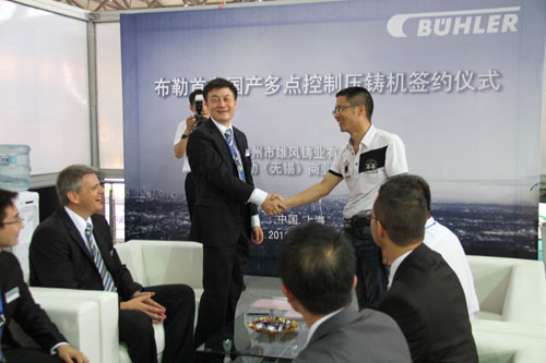 展會第一天,現場熙熙攘攘、熱鬧非凡。設備生產商帶來了各家最新的產品和工藝現場展示給業內同仁;許多外商、客戶直接與感興趣的參展企業洽談合作、談笑風生;值得一提的是,全球知名壓鑄機生產廠商—瑞士布勒(無錫)與臺州市雄風鑄業在展會現場舉辦了布勒首發國產多點控制壓鑄機簽約儀式。